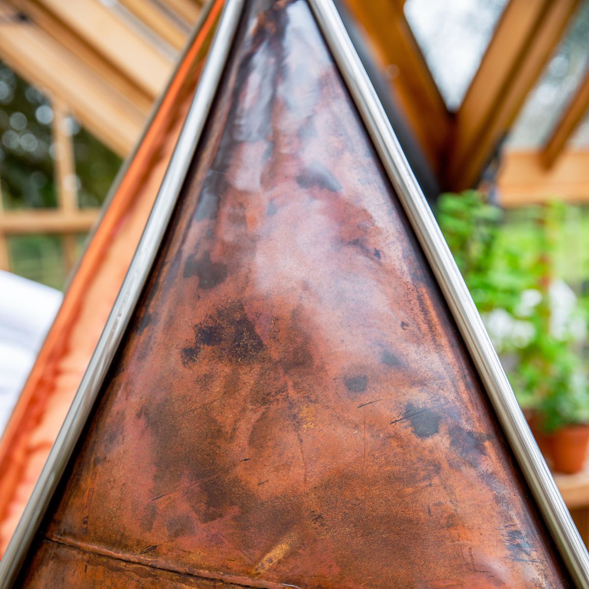 Each seat is painstakingly crafted from pure copper panels that are hand-beaten and meticulously formed to a stainless steel frame, ensuring durability and rigidity. The exterior of the seat is finished with a beautiful patina, which is achieved through a special annealing process that imbues each panel with its own unique character. The interior of the seat is highly polished, and the entire piece is coated with an exterior-grade lacquer that makes it weather-resistant for years of outdoor use.